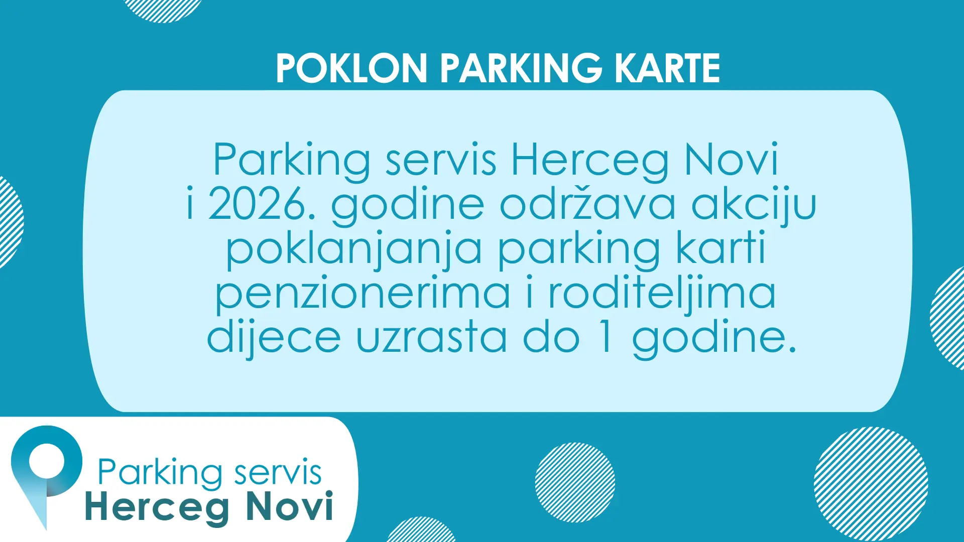 „Parking servis Herceg Novi“ d.o.o. Herceg Novi sa zadovoljstvom obavještava da i ove kalendarske godine održava akciju poklanjanja parking karti penzionerima i roditeljima dijece uzrasta do 1 godine.